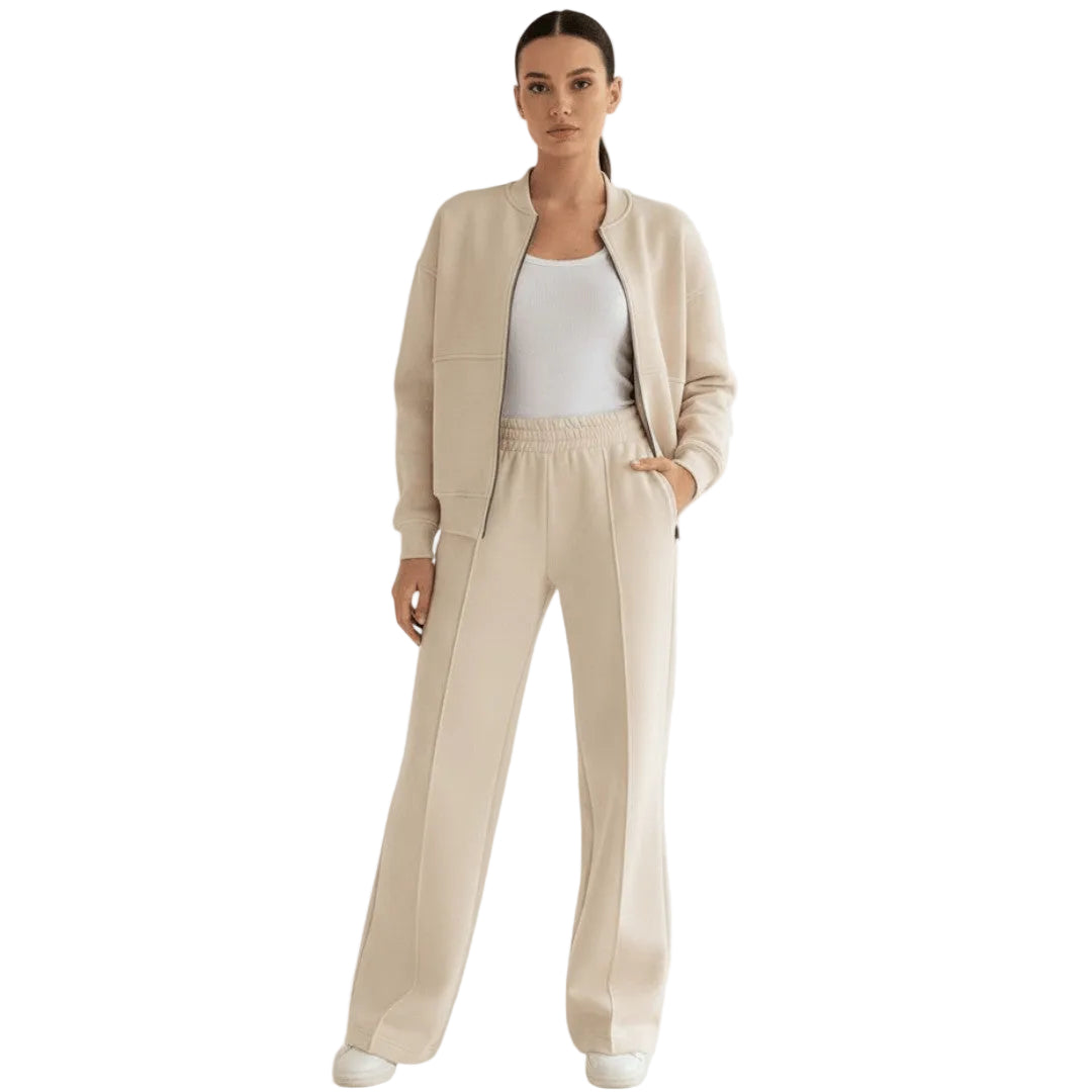 El conjunto Serena envuelve el cuerpo con una suavidad lujosa y una elegancia serena. Diseñado para mujeres que buscan equilibrio entre confort y estilo, es perfecto tanto para momentos de relax como para viajes o días activos. Su pantalón fluido de talle alto y la chaqueta con cremallera y delicada textura crean una silueta armoniosa que favorece todo tipo de cuerpos, proyectando seguridad y feminidad. El tono púrpura profundo aporta una sensación de calma, sofisticación y confianza natural.