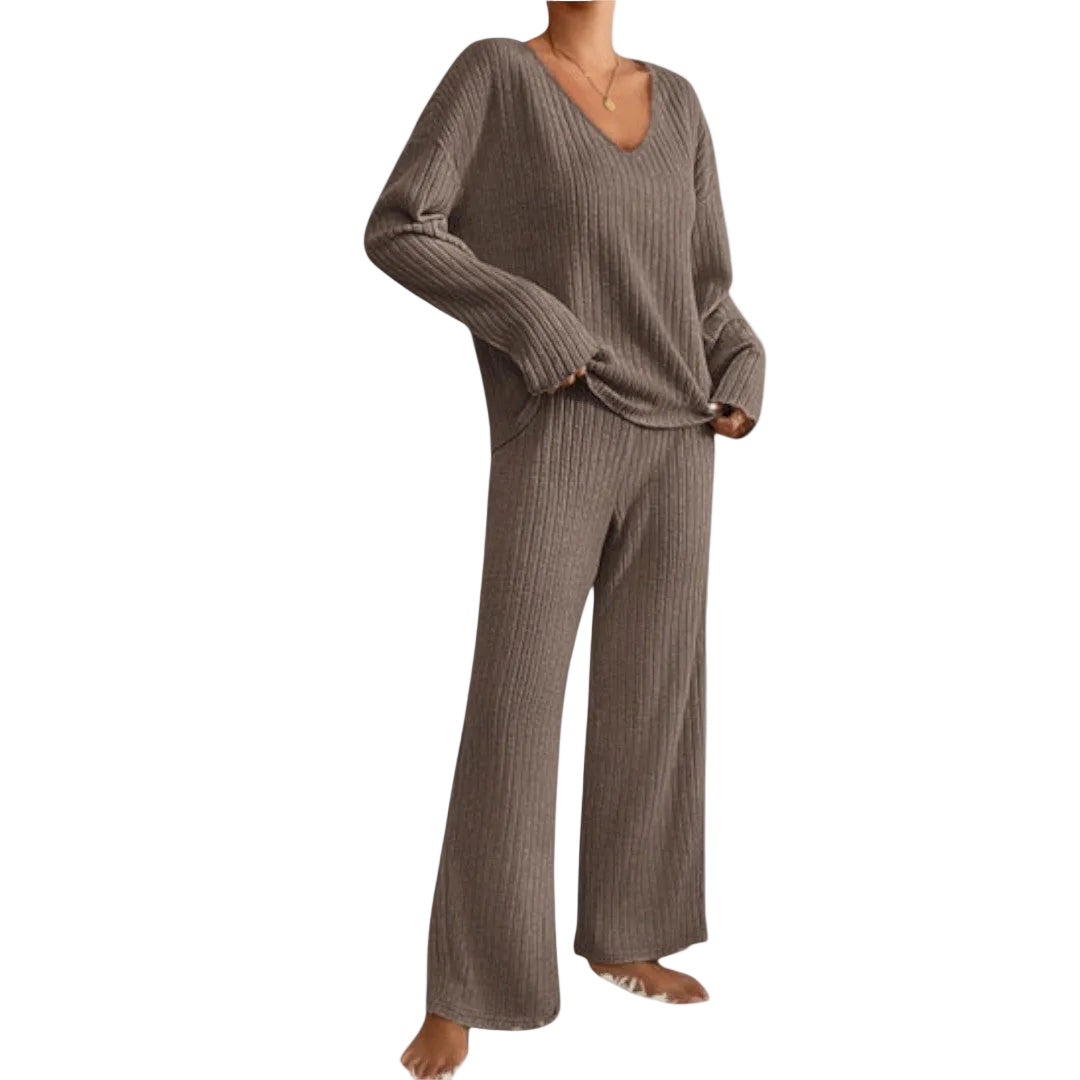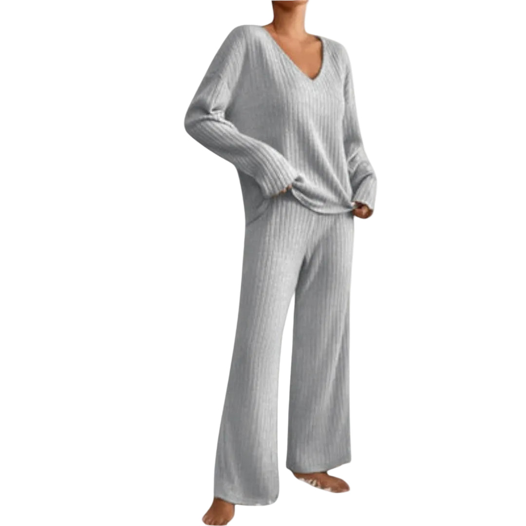 El conjunto KRISTEN combina un diseño sofisticado con un confort excepcional. Confeccionado en canalé con una mezcla suave de poliéster y nailon, ofrece una sensación lujosa y agradable al tacto, ideal para llevar todo el día con estilo.